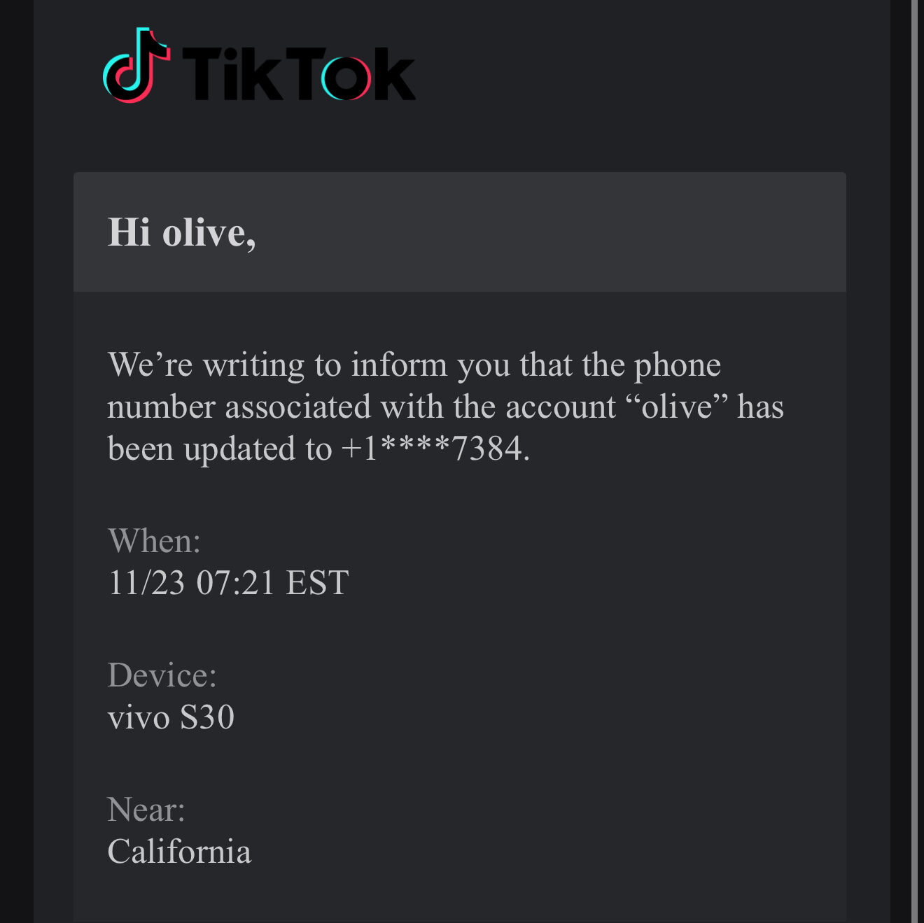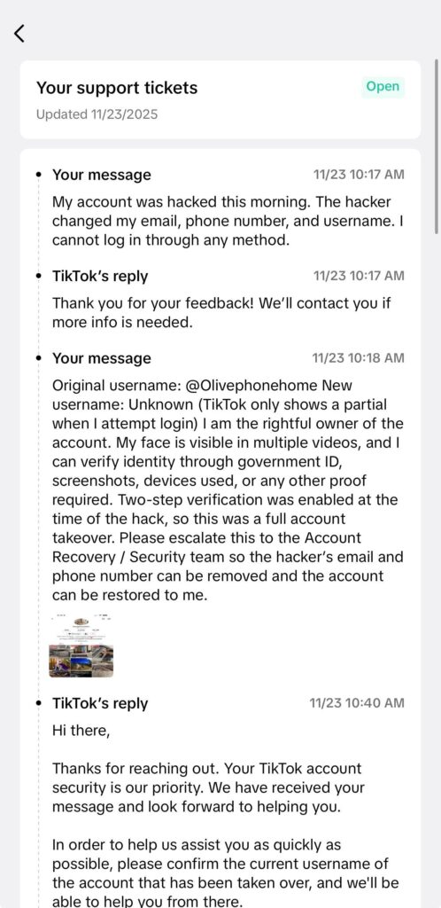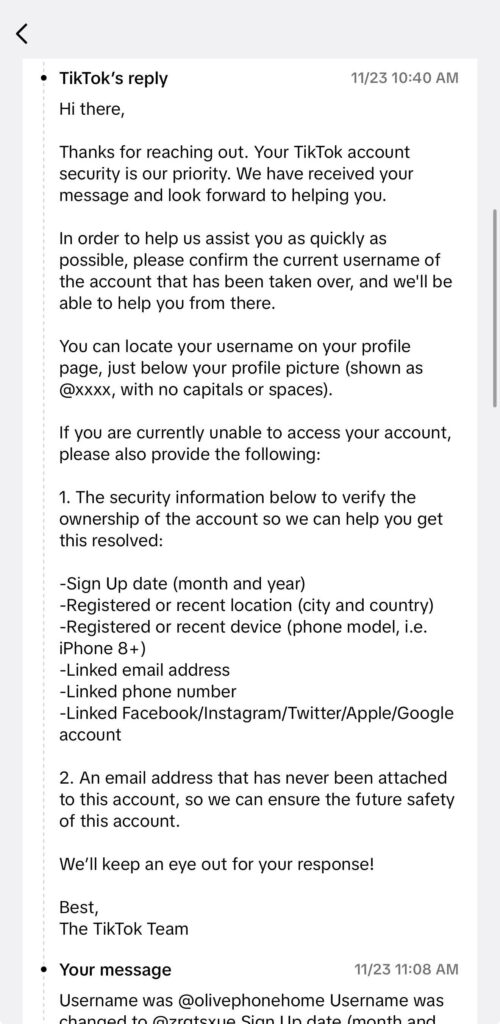 Nov 24, 9:02 PM: TikTok restored access and linked the account back to a new secure email.