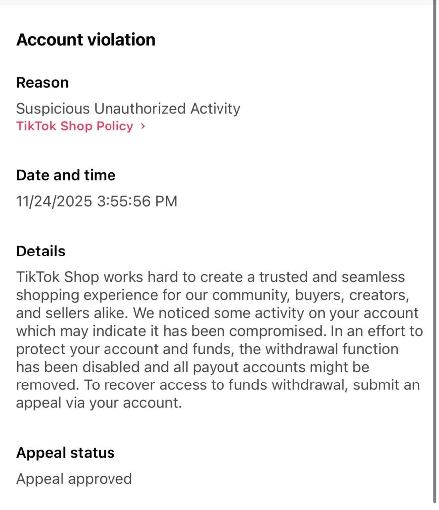 This helped reverse some monetization violations, including a TikTok Shop policy strike.