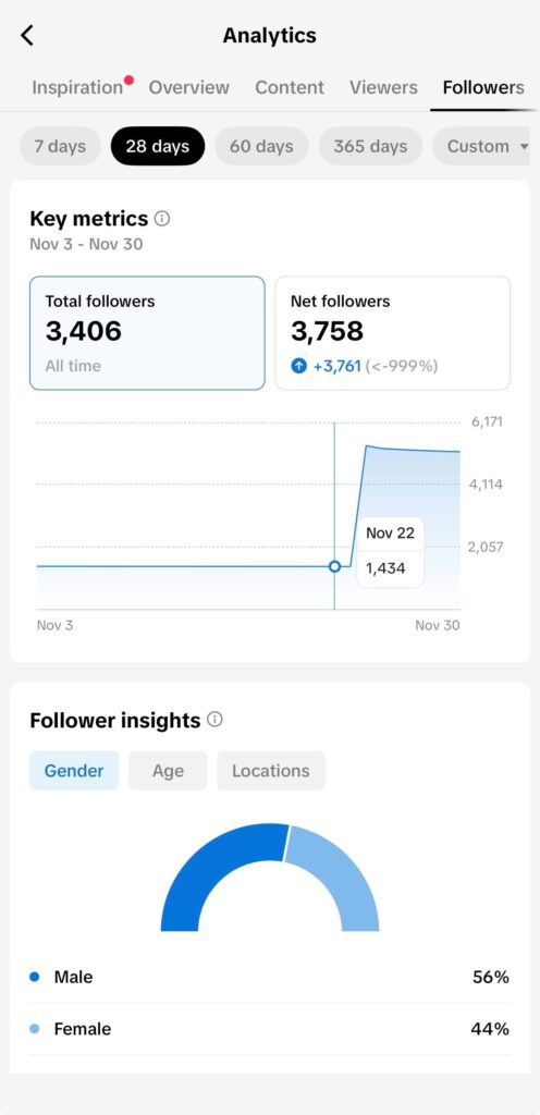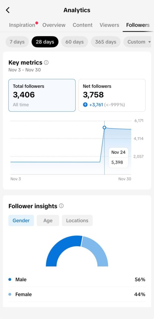 The follower graph plunged just as dramatically as it had spiked. The account had jumped from 1,434 to 5,398 on November 23. By November 30, it had returned to the low 3,000s. The location breakdown revealed what I had already suspected: nearly 60 percent of the followers were marked as “Other,” with the rest clustered in regions that my audience does not typically come from. Classic bot patterns.