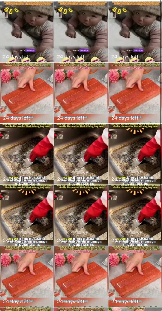 - Promoted cleaning tools, kitchen hacks, or fake countdown sales